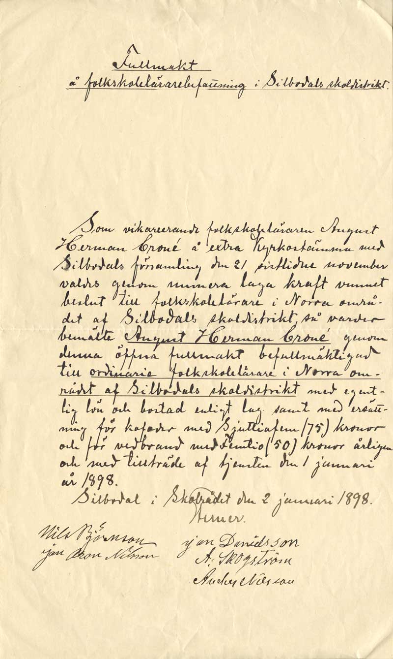 Som vikarierande folkskoleläraren August Herman Croné å extra Kyrkostämma med Silbodals församling den 21 sistlidne november valdes genom numera laga kraft vunnet beslut till folkskolelärare i Norra området af Silbodals skoldistrikt, så varder bemälte August Herman Croné genom denna öppna fullmakt befullmäktigad till ordinarie folkskolelärare i Norra området af Silbodals skoldistrikt med egentlig lön och bostad enligt lag samt med ersättning för kofoder med Sjuttiofem (75) kronor och för vedbrand med Femtio (50) kronor årligen och med tillträde af tjensten den 1 januari år 1898.