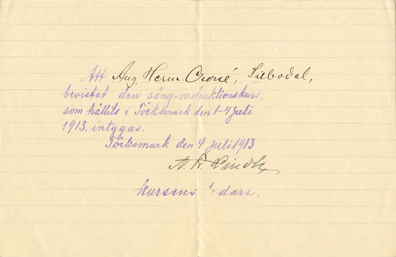 Att Aug. Herm. Croné, Silbodal, bevistat den sång-instruktionskurs, som hållits i Töcksmark den 1-4 juli 1913, intygas. Töcksmark den 4 juli 1913 A. R. Lindh,(?) kursens ledare.