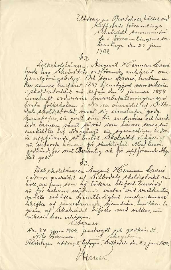 Folkskoleläraren August Herman Croné hade hos Skolrådets ordförande anhållit om tjenstgöringsbetyg. Och som Croné, hvilkens under senare halfåret 1897 tjenstgjort som vikarie i skoldistriktet och sedan den 1 januari 1898 innehaft ordinarie lärarebefattningen vid fasta folkskolan i Norra området af Silbodals skoldistrikt, visat sig innehafva goda kunskaper, ett godt sätt att undervisa och handleda barnen samt såväl som lärare som i sitt enskildta lif ådagalagt ett synnerligen hedrande uppförande, så beslöt Skolrådet enhälligt att vitsorda honom för skicklighet: Med beröm godkänd, för nit Berömlig och för uppförande: Mycket godt.