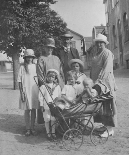Bakre raden: Maj-Ann, okänd, August Herman Croné, Anna Nilsson. Längst fram: Holger, Evy, Bror och Sven. (troligen 1924, i Arvika?)