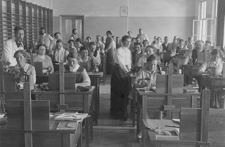 August, längst till vänster, bedriver vuxenundervisning. Övriga personer är okända. (ca 1910 - från skolan i Sölje ?)