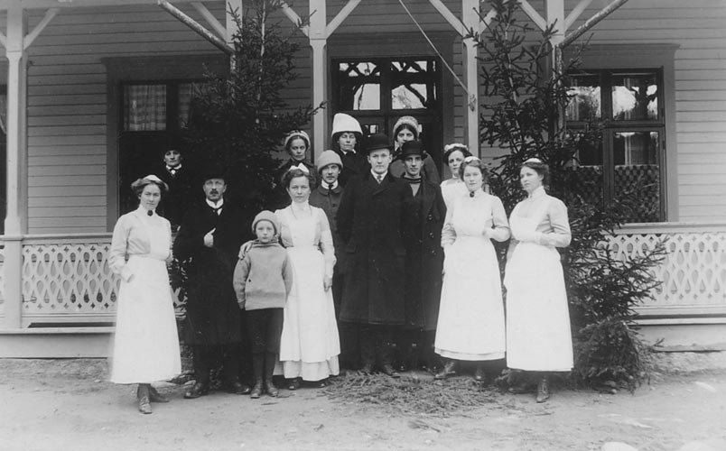 Cecilia Wallengren med sin fosterson och personal framför Tallåsen (1910-talet ?)