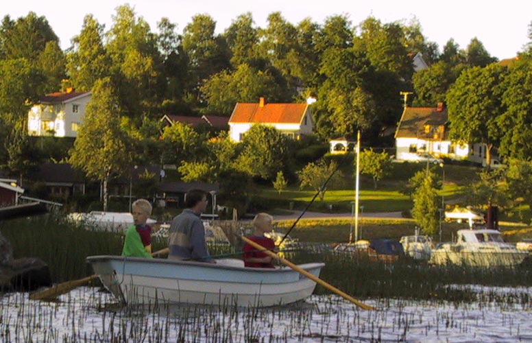Axel, Jan, Herman fiskar från båten vid vassruggen.