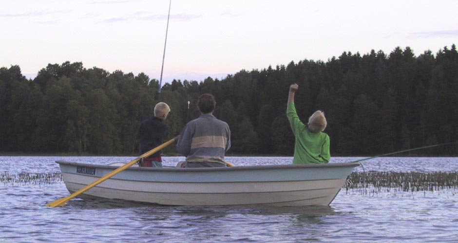 Herman, Jan, Axel fiskar från båten vid vassruggen.